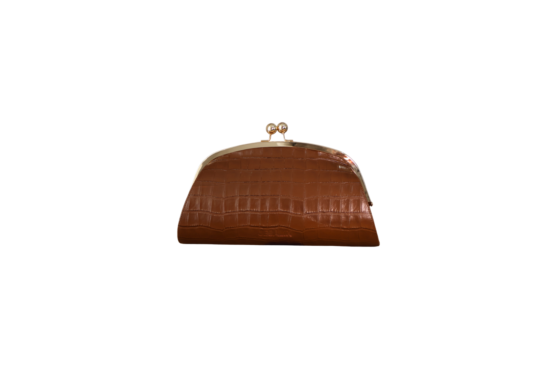 A clutch bag with a rigid structure and a gold kiss-lock frame. It has an elongated, curved silhouette, giving it an elegant touch. It's spacious enough to carry the essentials and can be comfortably held in one hand.